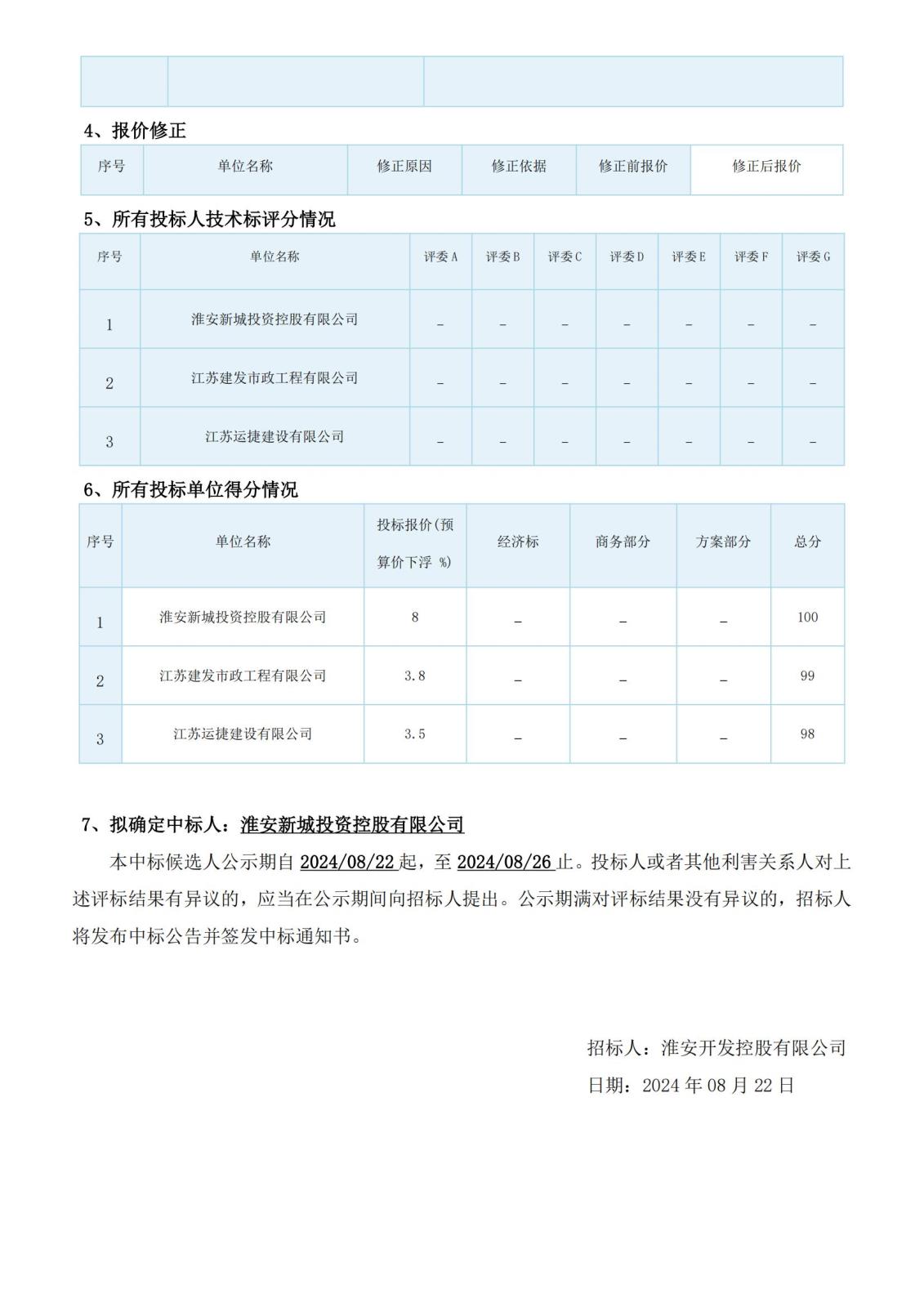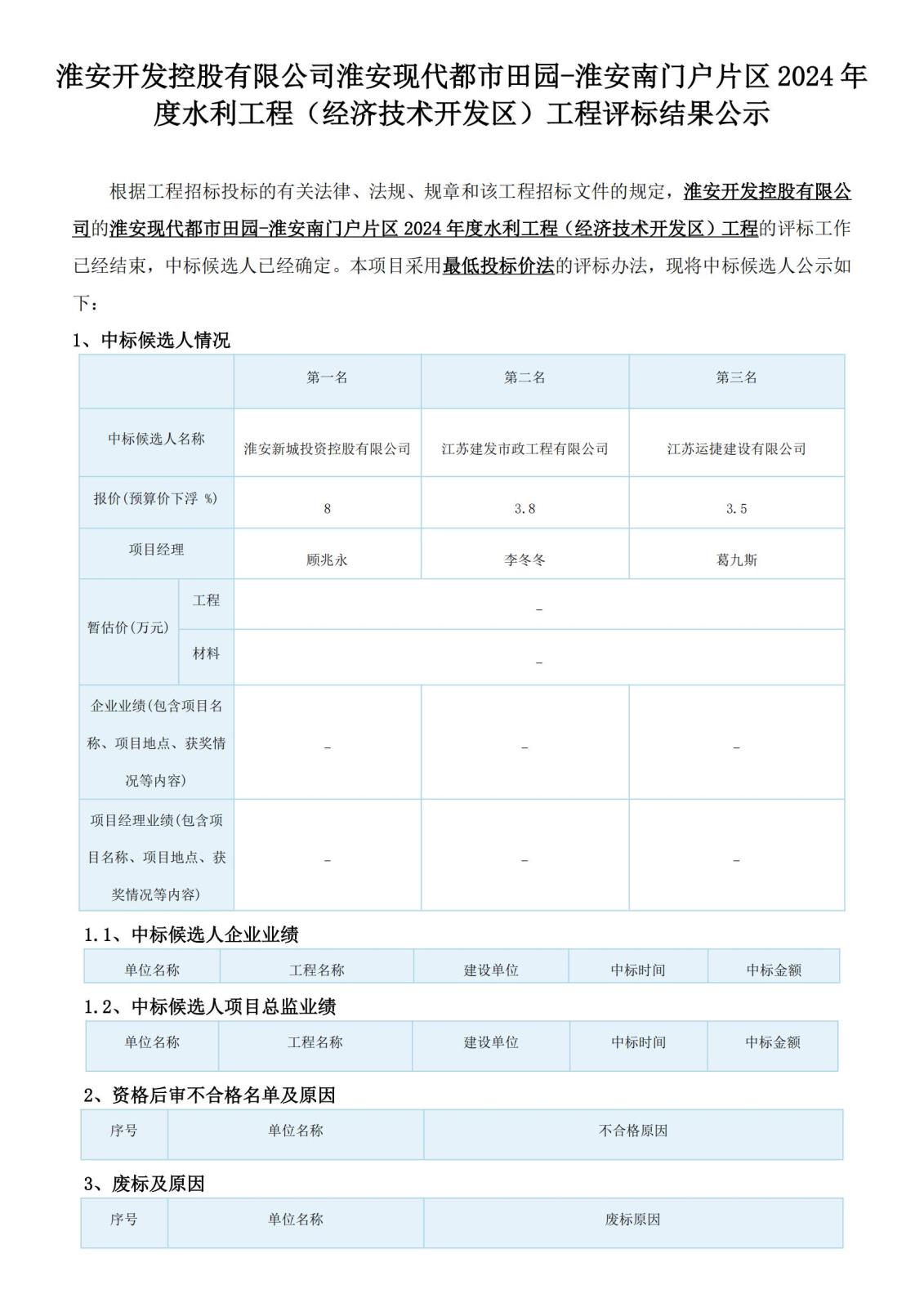淮安開發控股有限公司淮安現代都市田園-淮安南門戶片區2024年度水利工程(經濟技術開發區)工程評標結果公示